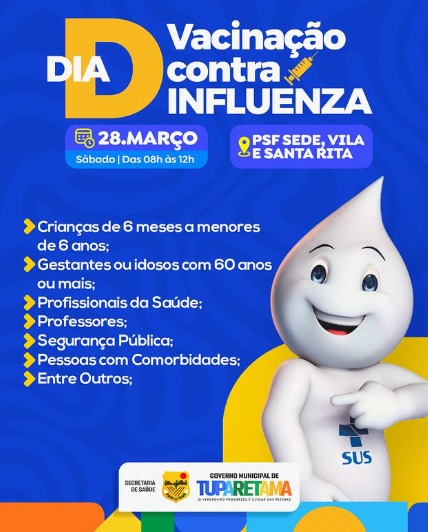 A Prefeitura de Tuparetama promove neste sábado, 28 de março, o Dia D de Vacinação contra a Influenza, com atendimento das 8h às 12h nos PSFs da Sede, Vila e Santa Rita. A ação tem como objetivo ampliar a cobertura vacinal e proteger a população contra o vírus da gripe, especialmente os grupos mais vulneráveis.