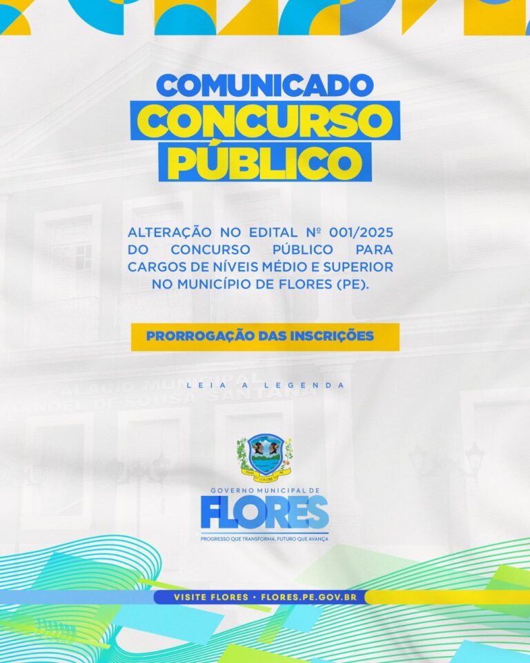 O Governo Municipal de Flores, no Sertão do Pajeú, anunciou a prorrogação do prazo de inscrições para o Concurso Público – Edital nº 001/2025. Os interessados agora têm até o dia 24 de novembro para garantir a participação no certame.