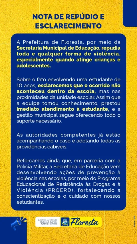 A Prefeitura de Floresta, por meio da Secretaria Municipal de Educação, emitiu uma nota de repúdio e esclarecimento sobre um fato envolvendo uma estudante de 10 anos. No comunicado, a gestão municipal reafirma sua posição contrária a qualquer forma de violência, especialmente quando atinge crianças e adolescentes.