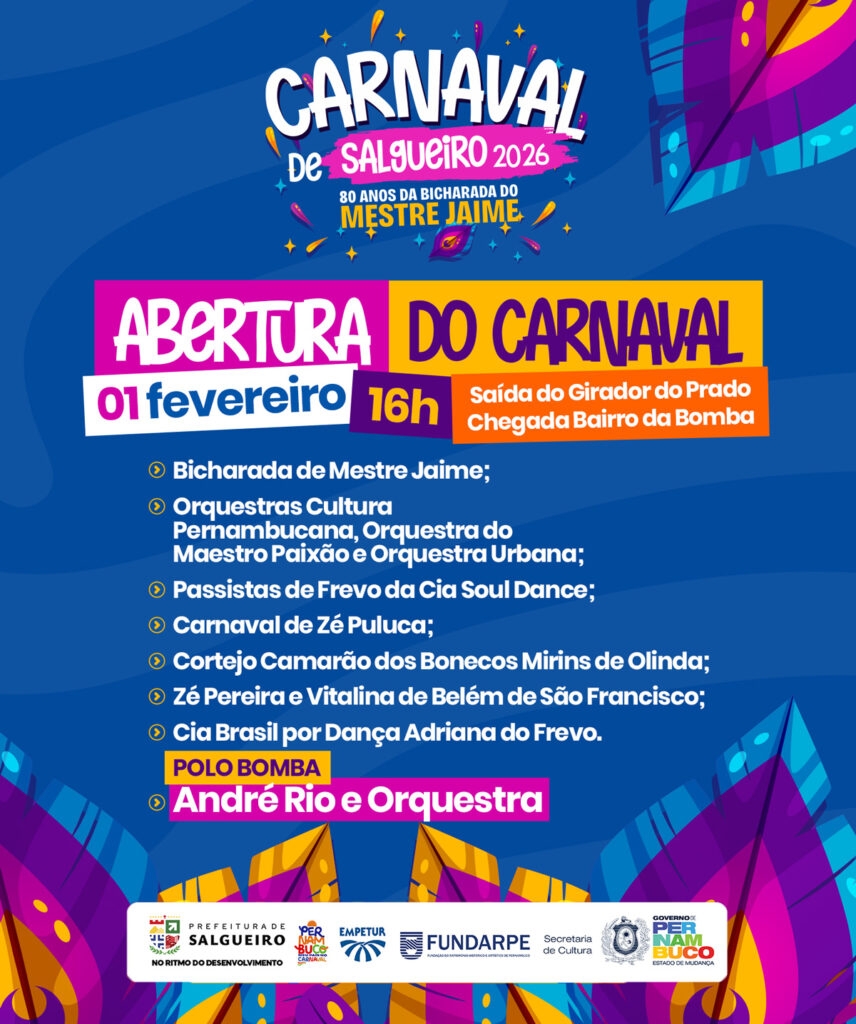 O arrastão cultural terá concentração no Girador do Prado, a partir das 16h, saindo rumo à Praça da Bomba, onde haverá show carnavalesco de André Rio e sua  orquestra. Uma festa que fará a alegria de foliões de todas as idades, demonstrando o que será o Carnaval de Salgueiro em 2026.